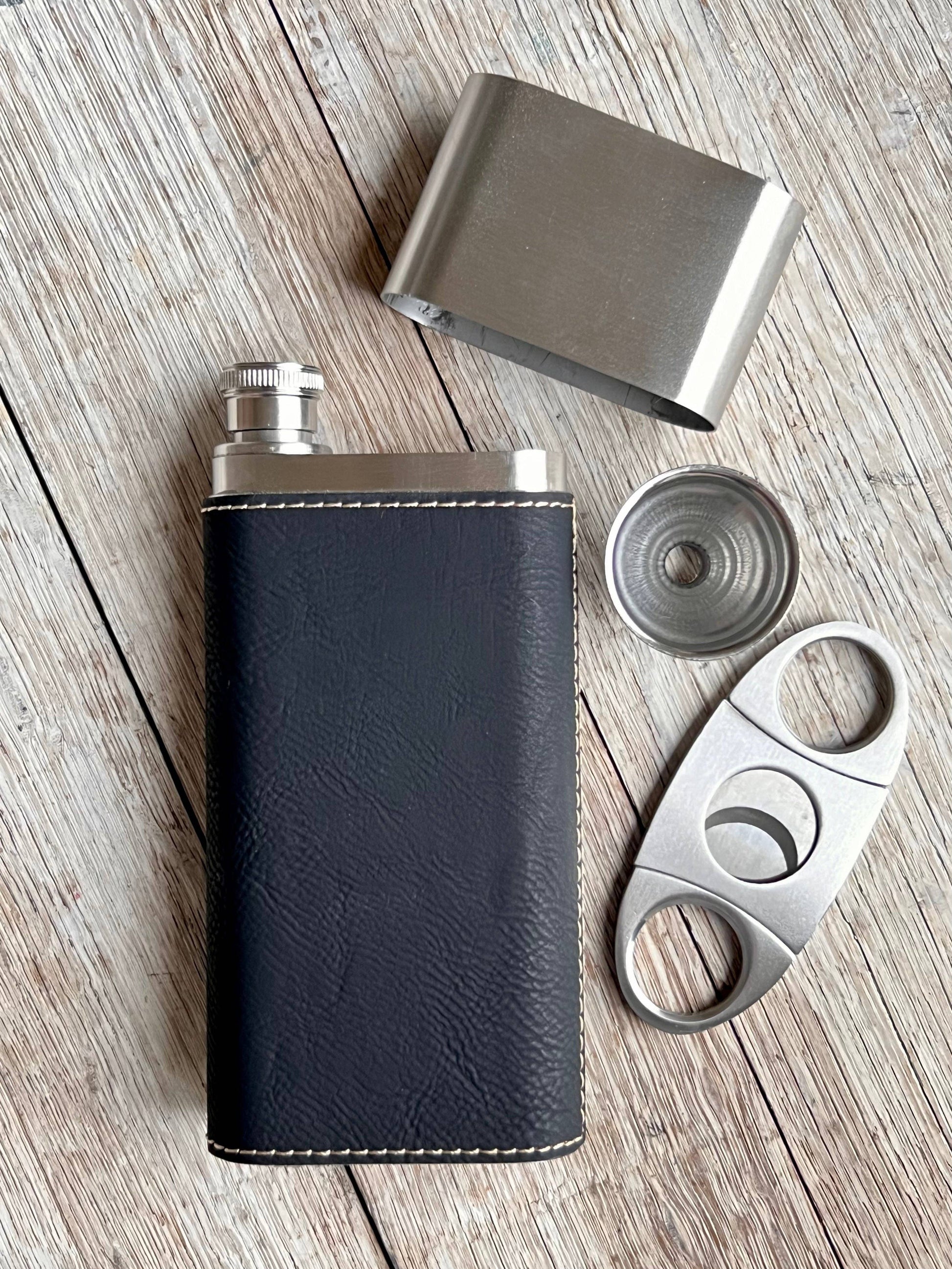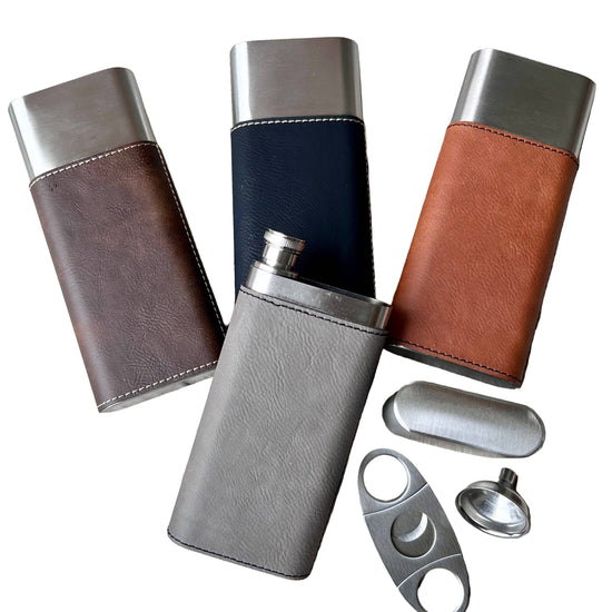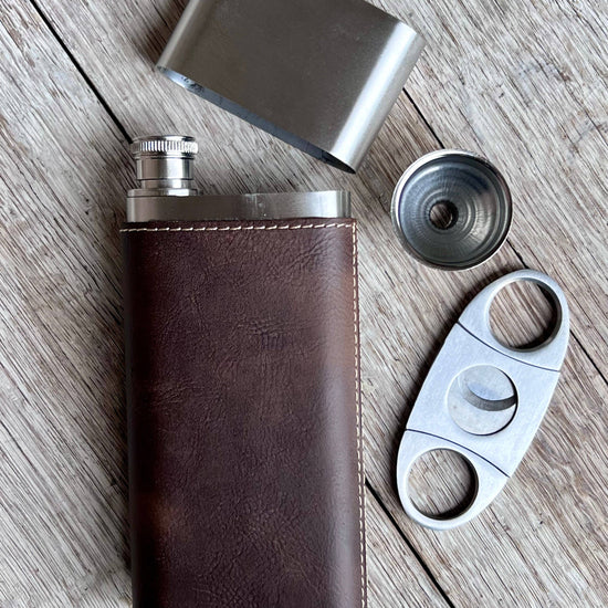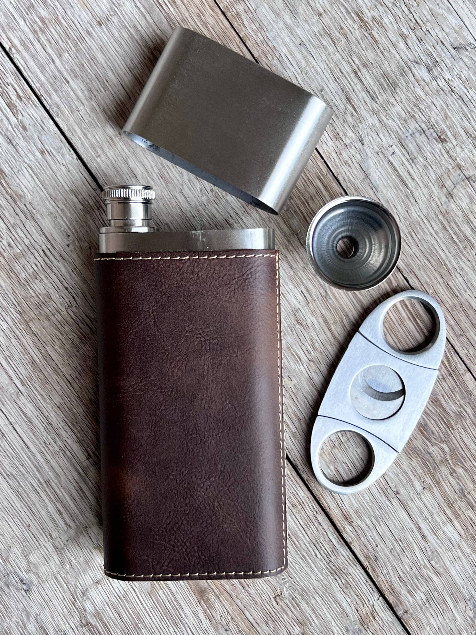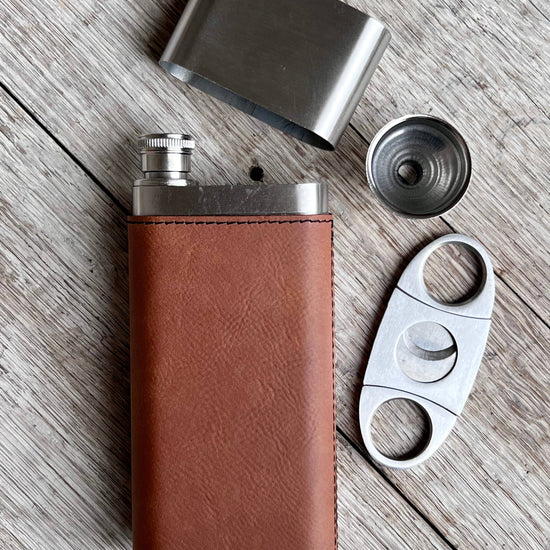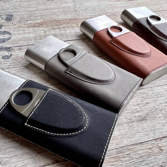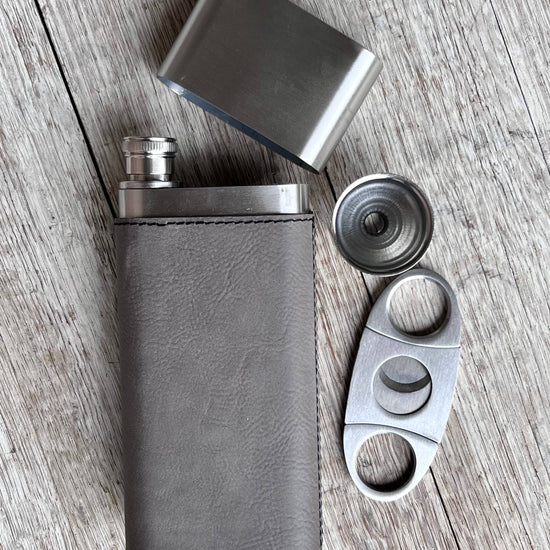 This durable stainless steel cigar and flask set is expertly wrapped in leatherette for a sleek look. It features a 2oz hip flask, a stainless steel cutter with a storage pocket, and a funnel. Designed to hold two large cigars (not included), the water-resistant synthetic material is easy to clean and built to withstand everyday use. Simply wipe it down with soap and water to maintain its finish. Dimensions are approximately 6 3/4” L x 2 7/8” W x 1 1/8”.
