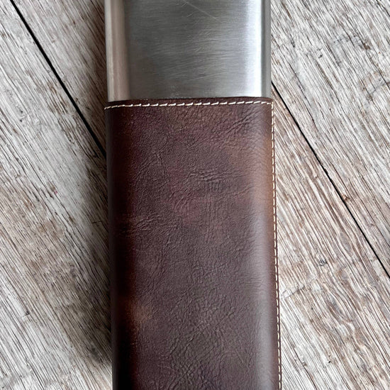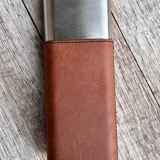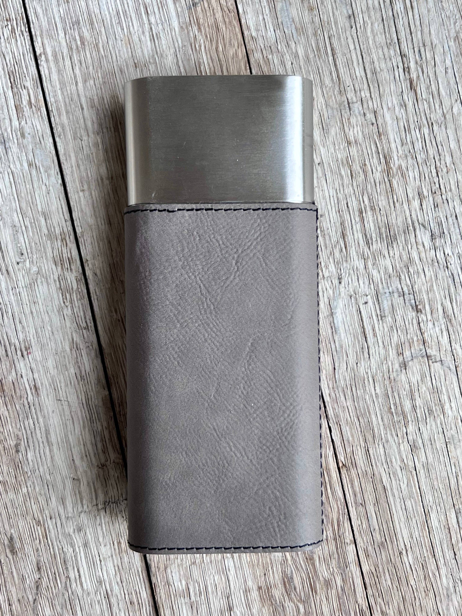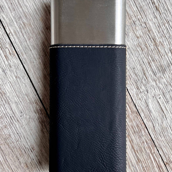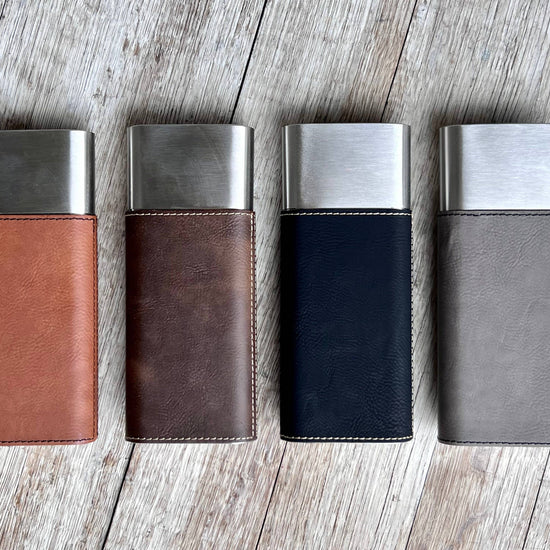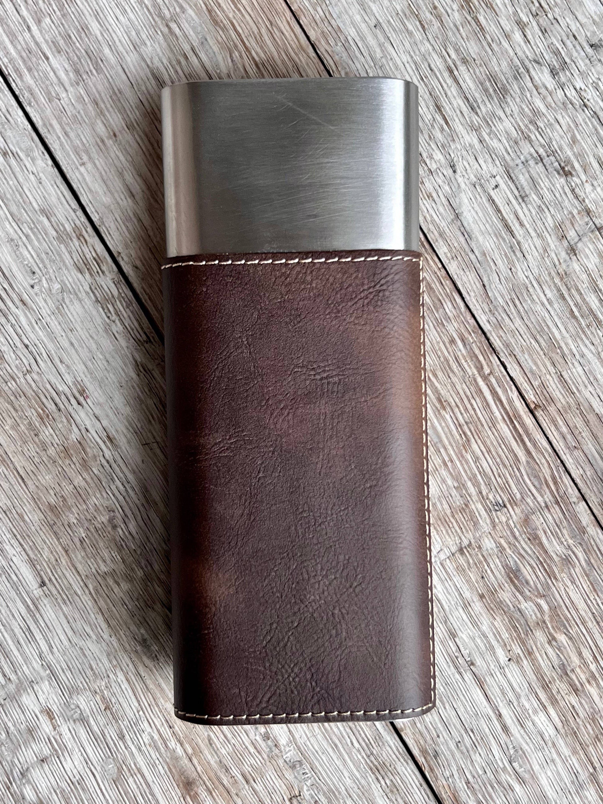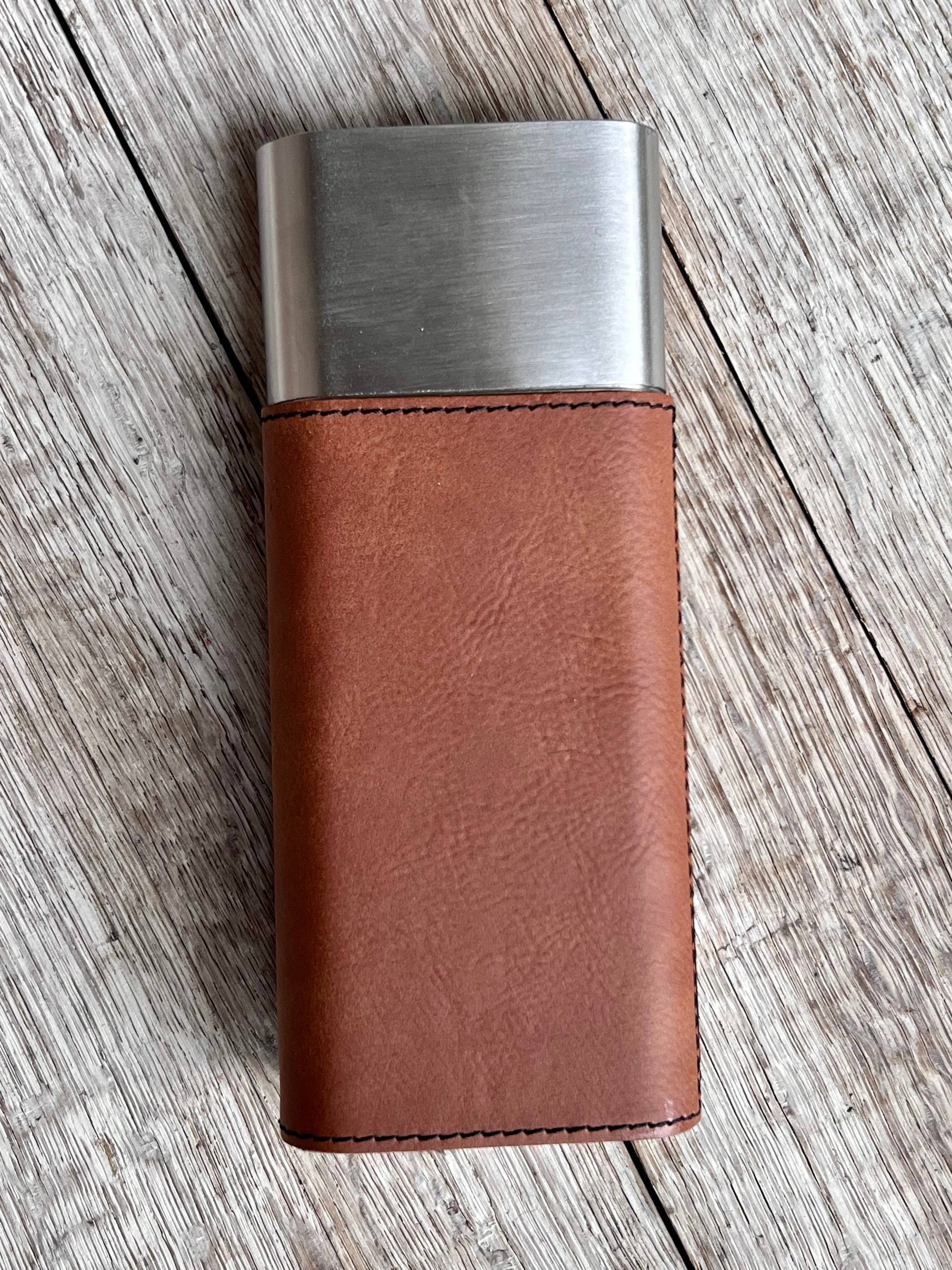 This durable stainless steel cigar and flask set is expertly wrapped in leatherette for a sleek look. It features a 2oz hip flask, a stainless steel cutter with a storage pocket, and a funnel. Designed to hold two large cigars (not included), the water-resistant synthetic material is easy to clean and built to withstand everyday use. Simply wipe it down with soap and water to maintain its finish. Dimensions are approximately 6 3/4” L x 2 7/8” W x 1 1/8”.