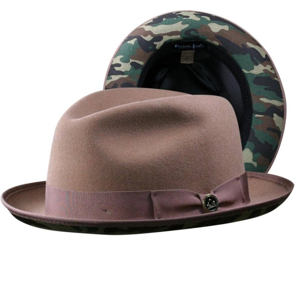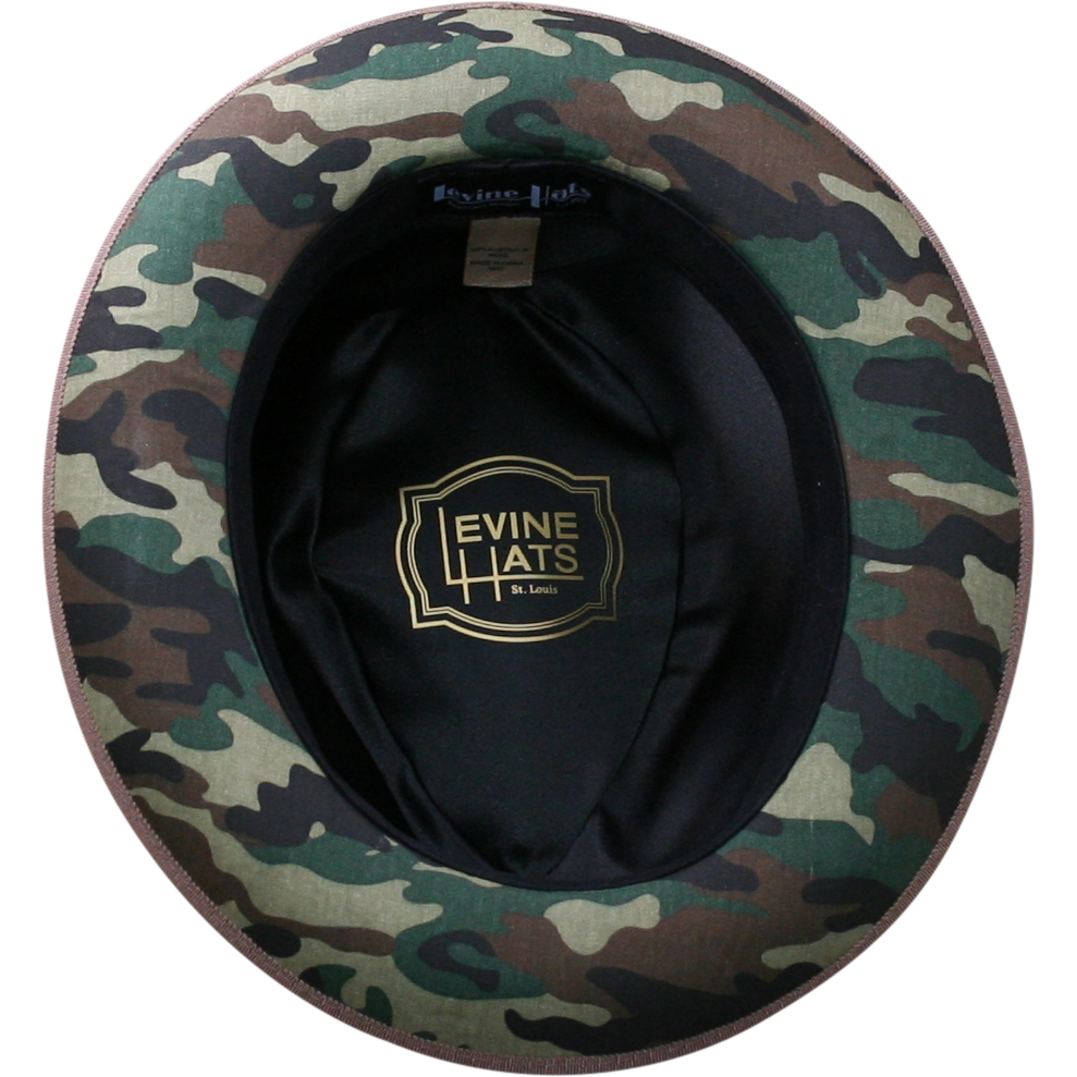Stand out with the camo bottom fedora—a true style essential for trendsetters. Featuring a 2 ¼" snap brim and 4 ½" center dent crown, it's crafted from 100% soft Australian wool felt with a full satin lining for superior comfort. The removable pin cloth sweatband and adjustable velcro drawstring ensure a perfect fit. Available in sizes MD through XL to suit your needs, this hat combines timeless design with modern versatility.