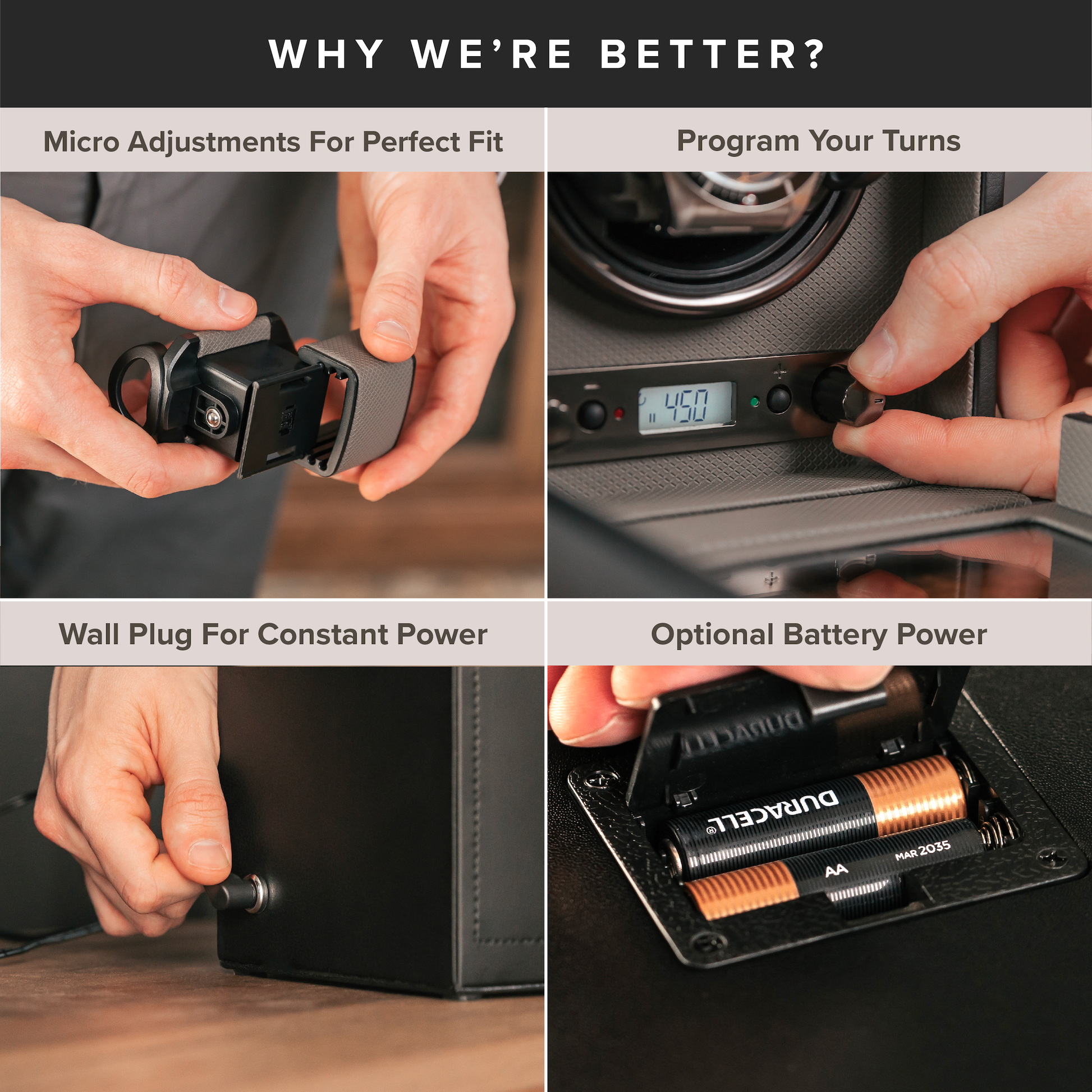 A PERFECT FIT, GUARANTEED - The included pillow is lined with padding to protect your watch surfaces and packs a secure ball joint mechanism that keeps your watch held firmly in place during rotations. The back of the pillow features a sleeve with micro-adjustments for an optimal fit for any metal bracelet, leather, or rubber strap.